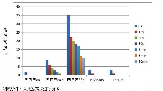 DP-106 在0.1%的活性物含量時在40℃以上幾乎無泡,并且可以有效的抑制體系的泡沫產(chǎn)生。