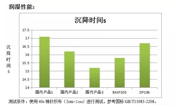 DP-106 具有很好的潤濕滲透能力,在0.1%的活性物含量時潤濕滲透時間為7秒以內(nèi)